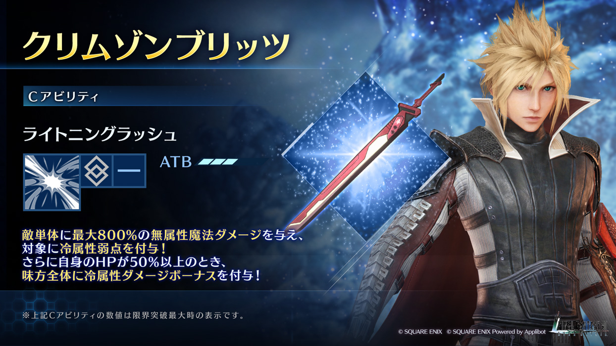 期間中、クラウドが装備可能な新たなコラボ武器「クリムゾンブリッツ」とグレンが装備可能な新たなコラボ武器「スノウバルディッシュ」の出現率が上昇しているガチャを開催!スタンプシートでは新登場のクラウド専用ウェア「アンビバレンス」を獲得できます!